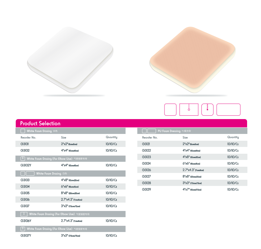 فوم ڈریسنگ نرم، پیڈڈ زخم کی دیکھ بھال کی مصنوعات ہیں جو جاذب، غیر محفوظ مواد سے بنی ہیں۔ ان کی کلیدی طاقت اعتدال سے لے کر بھاری زخم کی نکاسی کا انتظام کرنے میں مضمر ہے جبکہ زخم کے بستر کو جلد بھرنے کے لیے مناسب طور پر نم رکھنا ہے۔ نرم جھاگ کشن اور تحفظ فراہم کرتا ہے، اور ان کی نان اسٹک سطح درد سے پاک ہٹانے کی اجازت دیتی ہے۔